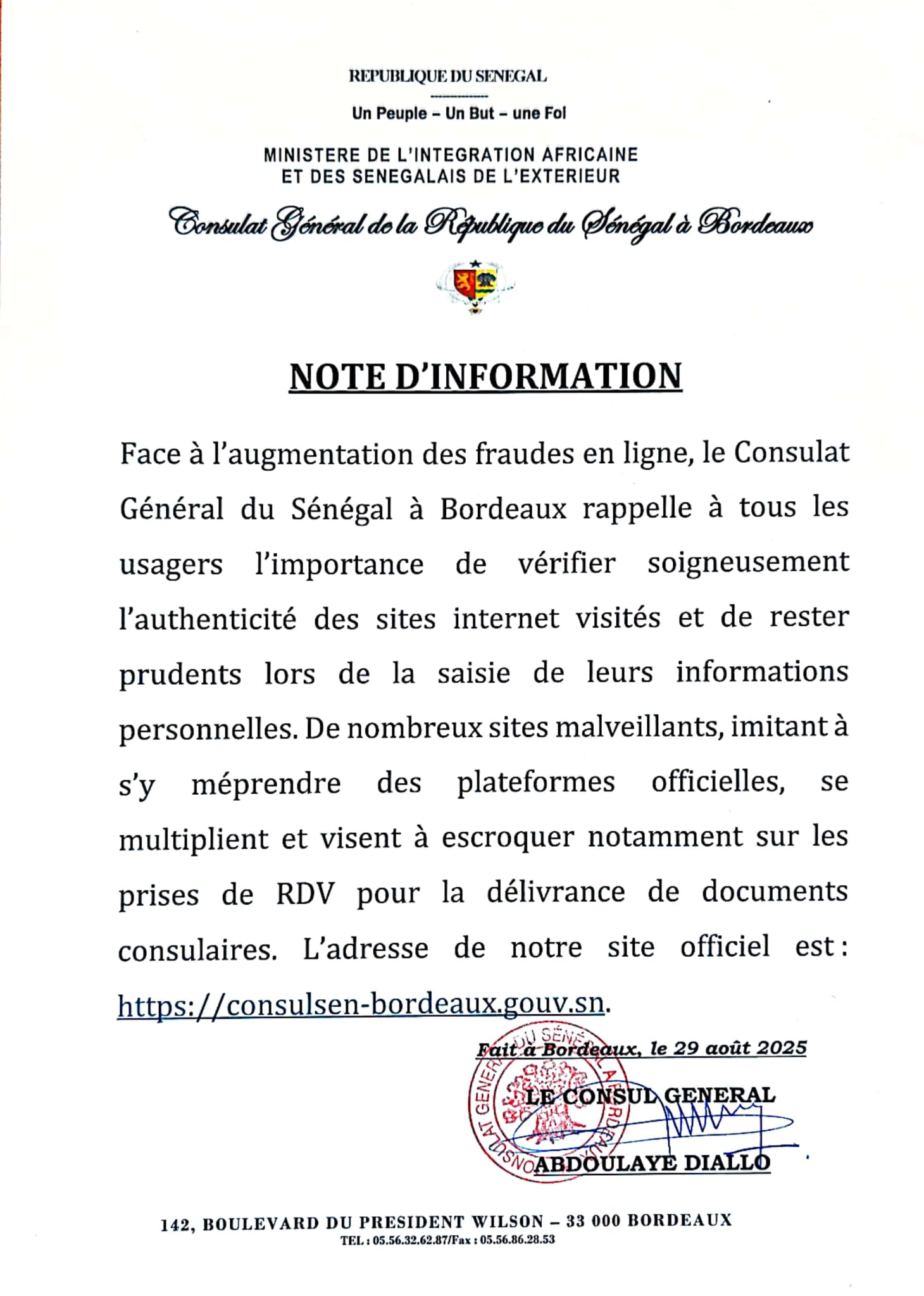 Face à l’augmentation des fraudes en ligne, le Consulat Général du Sénégal à Bordeaux rappelle à tous les usagers l’importance de vérifier soigneusement l’authenticité des sites internet visités et de rester prudents lors de la saisie de leurs informations personnelles. De nombreux sites malveillants, imitant à s’y méprendre des plateformes officielles, se multiplient et visent à vous escroquer sur les prises de RDV pour la délivrance de documents consulaire. L’adresse de notre site officiel est : https://consulsen-bordeaux.gouv.sn. Voir la note